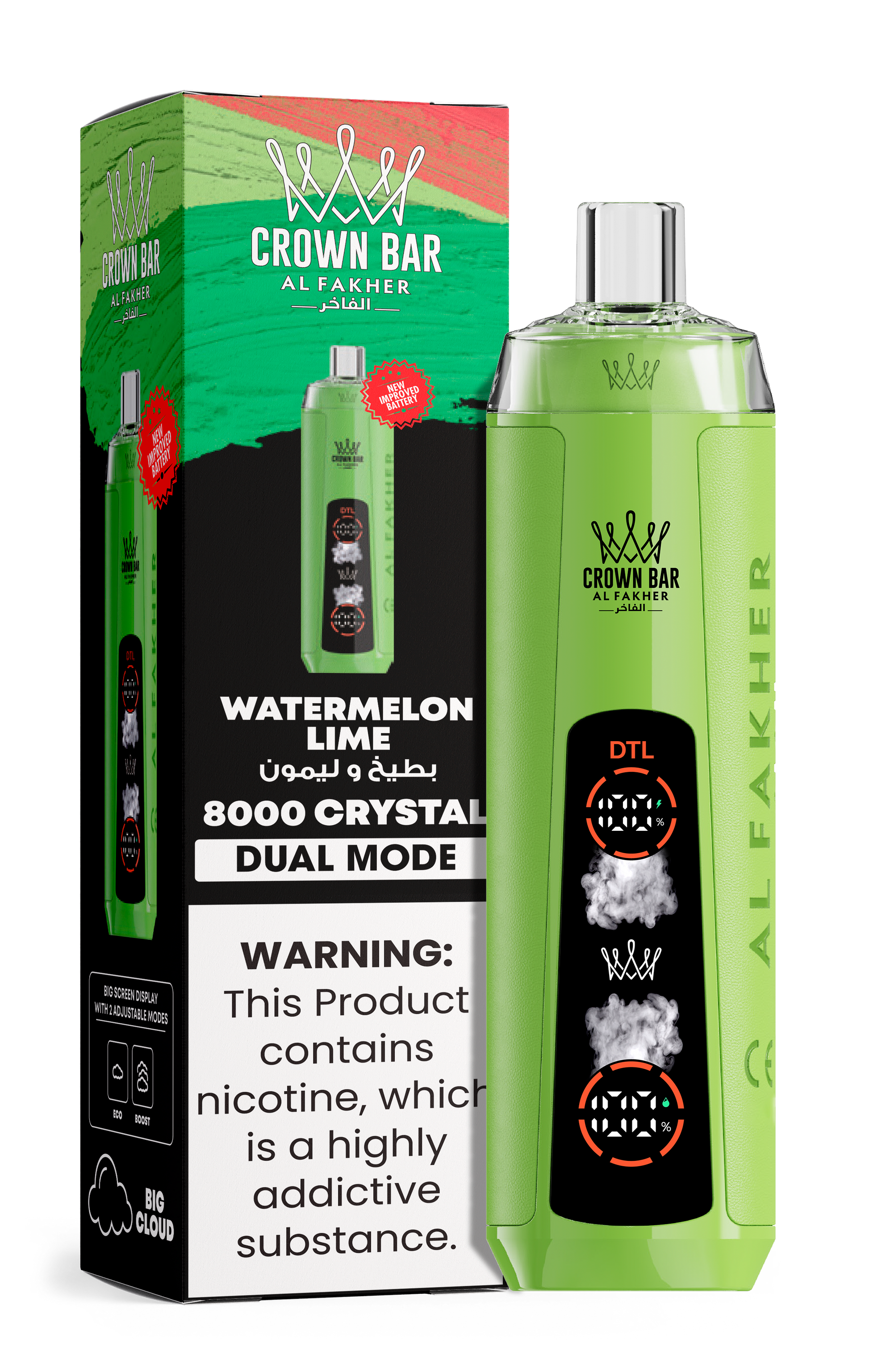 The AL Fakher Crown Bar Vape - Crystal 8000 Dual Mode Disposable Kit is designed for vapers seeking a simple, long-lasting, and enjoyable experience. With up to 8000 puffs, a rechargeable battery, and an advanced dual-mode system, this device offers ultimate convenience and flexibility. It features a large display to show battery level, fill level, and mode selection. Choose between two power modes—Eco and Boost—to customize your vaping experience and ensure you’re always at your best on the go.